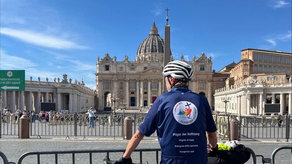 Während tausende von Katholiken per Flugzeug oder Bus nach Rom wallfahrten, legt Josef Osterloh, eines unserer Gemeindemitglieder, die 2000 Kilometer lange Strecke mit dem Rad zurück.